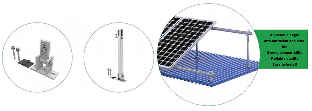 Hệ thống lắp đặt năng lượng mặt trời trên mái nhà có thể điều chỉnh dễ dàng phù hợp với mái nhà do góc nghiêng có thể thay đổi và các tùy chọn chân đế . Nó có thể được cố định hoặc điều chỉnh độ nghiêng, đáp ứng các điều chỉnh cụ thể của dự án để tối ưu hóa sản lượng năng lượng mặt trời. Thiết kế cải tiến này loại bỏ nhu cầu cắt, hàn tại chỗ, có chi phí thấp và lắp đặt nhanh chóng.