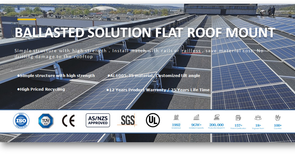 Hệ thống lắp đặt mái phẳng ba chân ballast tương đối dễ lắp đặt và có thể được thực hiện nhanh chóng, điều này có thể giảm thời gian lắp đặt và chi phí lao động. hệ thống lắp đặt mái phẳng ba chân ballast là một giải pháp hiệu quả và hiệu quả cho việc lắp đặt bảng điều khiển năng lượng mặt trời trên mái nhà phẳng đòi hỏi sự ổn định và an toàn mà không cần phải xuyên mái nhà.