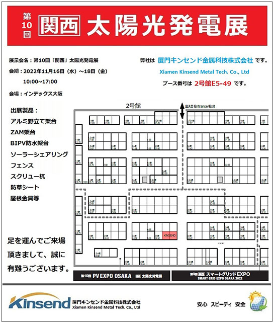 弊 社 は 2022 11/16 11/18 に イ ン テ ッ ク ス 大阪 に 開 催 さ れ 10 回 関 西 太 陽光 発 電 展 に 出 す。 10 回 関 西 陽光 陽光 電 電 展