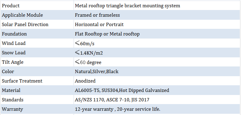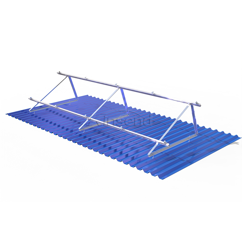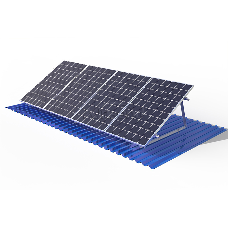 Hệ thống giá treo tam giác trên mái nhà bằng kim loại là một loại hệ thống giá đỡ được thiết kế cho mái nhà bằng kim loại. Nó sử dụng các giá đỡ hình tam giác được gắn vào mái kim loại bằng vít hoặc ốc vít khác. Các tấm pin mặt trời sau đó được gắn vào giá đỡ, tạo ra một nền tảng an toàn và ổn định cho các tấm pin mặt trời. Hệ thống lắp mái hình tam giác là một giải pháp hiệu quả và hiệu quả cho việc lắp đặt tấm pin mặt trời trên mái nhà bằng kim loại đòi hỏi sự ổn định và an toàn mà không cần phải xuyên mái nhà.