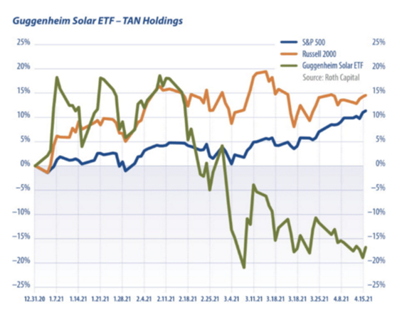 Vào tháng Tư năm nay, Invesco etf Solar, theo dõi Mac's Chỉ số năng lượng mặt trời toàn cầu, được thực hiện tồi tệ hơn đáng kể so với S & P 500 và Dow Jones Industrial Index. The Guggenheim Solar ETF (TAN) giảm 8,7%, trong khi S & P 500 và Dow Rose 3,4% và 2,7% tương ứng. So với tháng 12 năm ngoái, Guggenheim Solar ETF (TAN) đã tăng 23,2%, trong khi tiêu chuẩn & Nghèo là 500 chỉ số và Dow Chỉ số Jones chỉ tăng 2,6%.