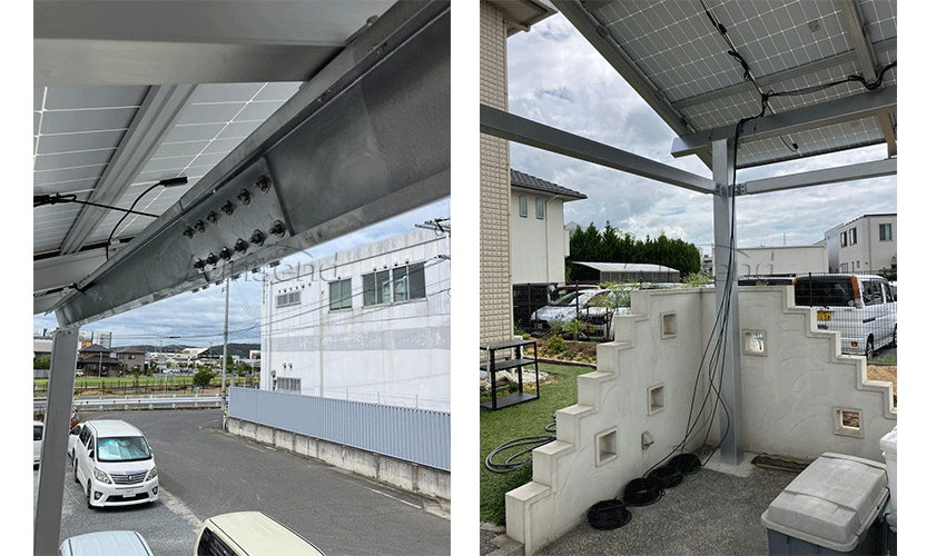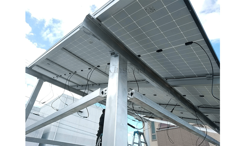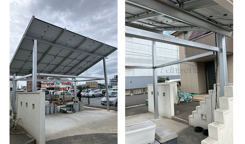 Nhà để xe năng lượng mặt trời chống nước mới Kinsend đã được lắp đặt thành công tại Nhật Bản. Đế được cố định bằng bu lông nhúng, sau đó bê tông được tưới và san bằng. Khung thép carbon cường độ cao có độ ổn định cao và có thể hỗ trợ các tấm pin kích thước lớn. Nó có khả năng chống địa chấn tốt, chống gió, chống áp lực tuyết và chống ăn mòn.